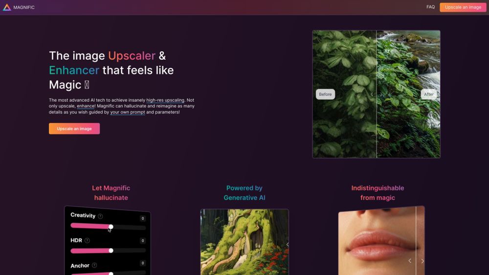 AI 图像放大和增强工具,重新构想细节并改善分辨率。。