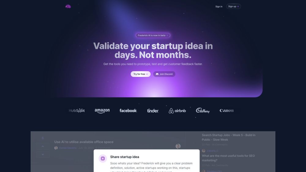 Frederick AI 验证创业想法,创建商业计划,并利用 AI 合作伙伴收集用户反馈。。