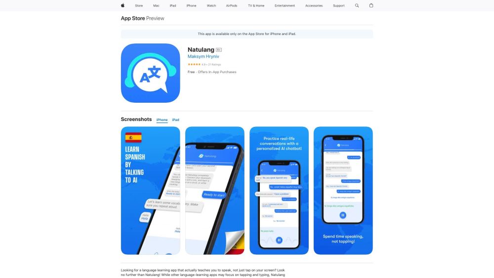 专注于与AI聊天机器人进行口语练习的语言学习应用。。