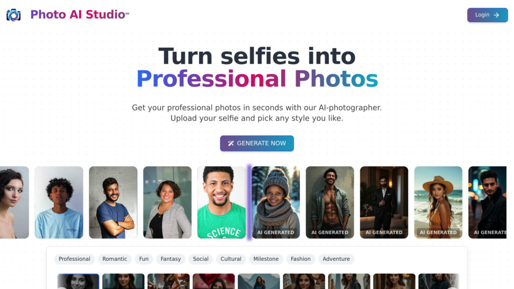 AI驱动的照片生成器,数秒内将单张自拍转化为多种风格的专业高质量照片。。